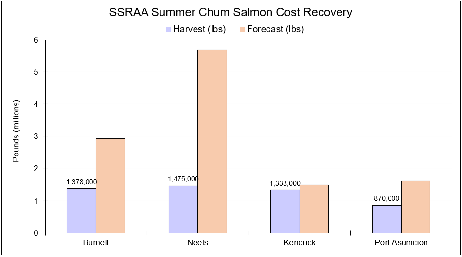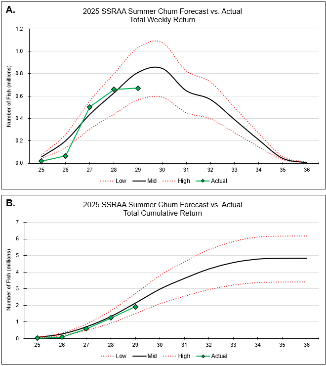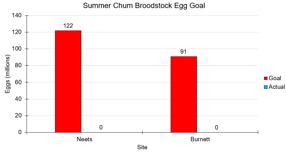 | | Kendrick Bay reopened to common property fishing on July 10th, following the successful harvest of 1.3 million pounds for cost recovery. At Burnett Inlet, cost recovery is ongoing, with approximately 1.4 million pounds harvested so far, putting us at almost 50% of our cost recovery goal. There is currently a large volume of chum inside Burnett Inlet, including the 800,000 pounds needed for broodstock, and harvest vessels are actively fishing. Otolith reads from Burnett Inlet cost recovery are 80-85% 4yos for SW 29, with an average weight of 8lbs and a sex ratio of 56% male. At Neets Bay, 1.5 million pounds have been harvested to date, or about 25% of our forecast. Otolith samples show an age composition of ~50% 4yos, 30% 3yos and 10% 5yos, with an average weight of 8lbs and a sex ratio of 68% male. In Port Asumcion, almost 900,000 pounds have been harvested to date, or 50% of our forecast. Fishing is ongoing at all sites. Overall, a total of 5.1 million pounds of cost recovery have been harvested to date, putting us at 43% of our total forecast. | | Figure 5. SSRAA summer chum cost recovery actual (purple) vs. forecasted (orange) harvest in pounds by release site. Numbers above the purple bar represent the harvest in pounds. | | SSRAA's broodstock goal for 2025 is 213 million eggs split 60/40 between Neets Bay and Burnett Inlet. Broodstock collection for Neets Bay began last week, using a passive brood gate and a seiner. To date, 30,000 chum salmon are behind the barrier net, 2,000 of which recruited through the gate. Burnett Inlet also has the broodstock they need staged in front of the fish ladder. Eggtake is expected to begin around the end of July. | | Figure 6. SSRAA broodstock goal (red) vs. actual (blue) number of eggs collected by site. | | We are currently at 40% of the SSRAA summer chum forecast, with almost 2 million chum salmon harvested to date. Harvest through SW 29 typically represents 32% of the total return, with the peak of the return expected next week. | | Figure 7. SSRAA summer chum return by stat week (A.) and cumulatively (B.) for actual (red) vs. forecasted (black) numbers. | | Table 4. SSRAA chum salmon contributions by release site, gear group, and fishery. | |