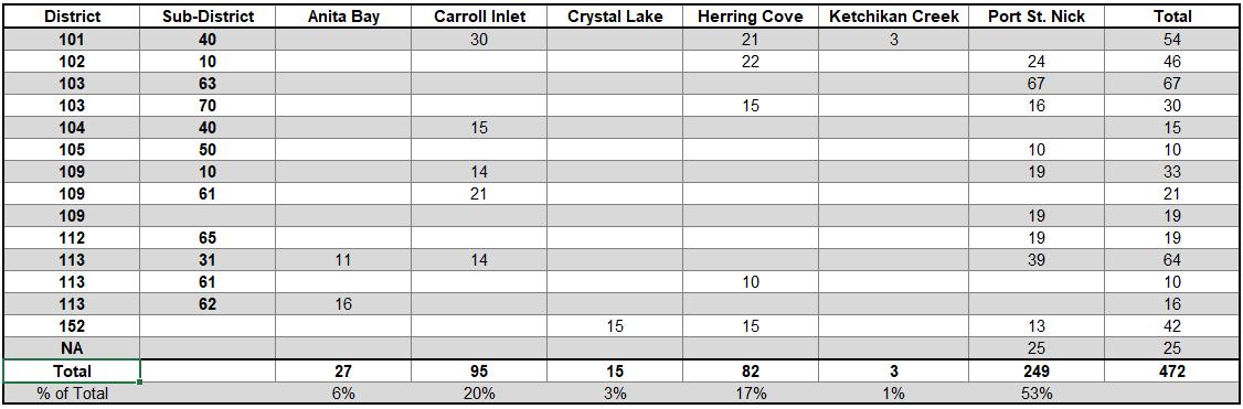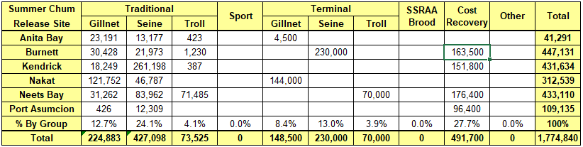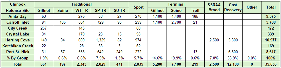 | | Table 1. Coded-wire tag expansions of Chinook salmon harvested in the first retention period of the summer troll fishery. | | For SSRAA released Chinook salmon, the highest contributions to the summer troll fishery are from Port St. Nick (53%), Carroll Inlet (20%), and Herring Cove (17%). CWT expansions are still preliminary at this time. | | Table 2. Coded-wire tag expansions of SSRAA Chinook salmon caught in the summer troll fishery by release site. | | Table 3. SSRAA Chinook salmon contributions by release site, gear group, and fishery. | |