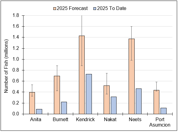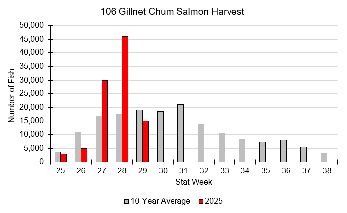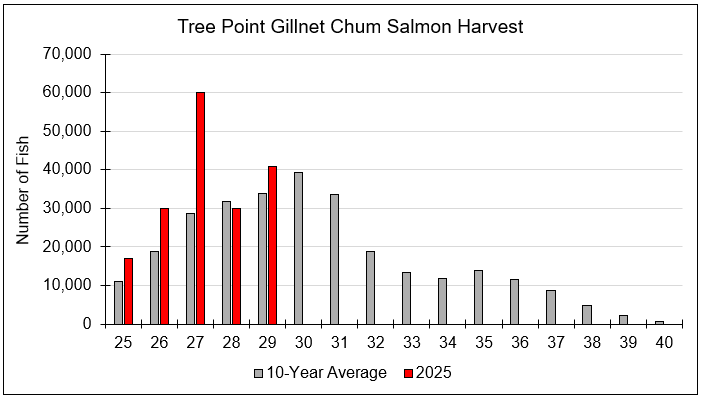 | | Figure 1. Age-class composition of chum salmon harvested in the Neets Bay chum troll fishery by stat week. | | For more information on the troll fishery, follow the links: | | Figure 2. SSRAA chum salmon 2025 forecast (orange bars) vs. the 2025 return (blue bars) to date by release site. Error bars represent the high and low range of the forecast by site. | | Catches increased at Tree Point, from 29,000 chum salmon in SW 28 to 41,000 in SW 29. This week's catch composition was 45% Nakat 4yos, 22% Nakat 3yos, and 16% wild chum salmon. The average weight was 8.1lbs, compared to 8.8lbs for SW 28. | | Figure 3. Chum salmon catch in the 101 gillnet fishery in 2025 (red bar) compared to the 10-year average (grey bar). | | In district 6, catches dropped to just below the 10-year average, with 15,000 chum salmon harvested in SW 29. It should be noted that while this is significantly lower than the harvest in SW 28, the number of days the fishery was open was also reduced from four days to two. Otoliths indicate that the large catch in SW 28 was made up of Neets Bay 3yos (23%), Anita Bay 4yos (20%), Anita Bay 3yos (7%), Burnett 4yos (18%), and Burnett 3yos (9%). The average weight was 7.0lbs, compared to 7.8lbs in SW 27. | | Figure 4. Chum salmon catch in the 106 gillnet fishery for 2025 (red line) compared to the 10-year average (grey bars). | | ADF&G advisory announcements with the most up-to-date information and catch numbers can be found here. | |
