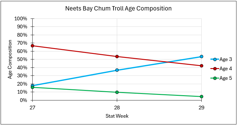 Otolith data collected from the chum troll fishery indicate a catch composition of 53% 3yos, 42% 4yos, and 4% 5yos with an average weight of 7.4lbs for SW 29, compared to 8.5lbs for SW 28.
