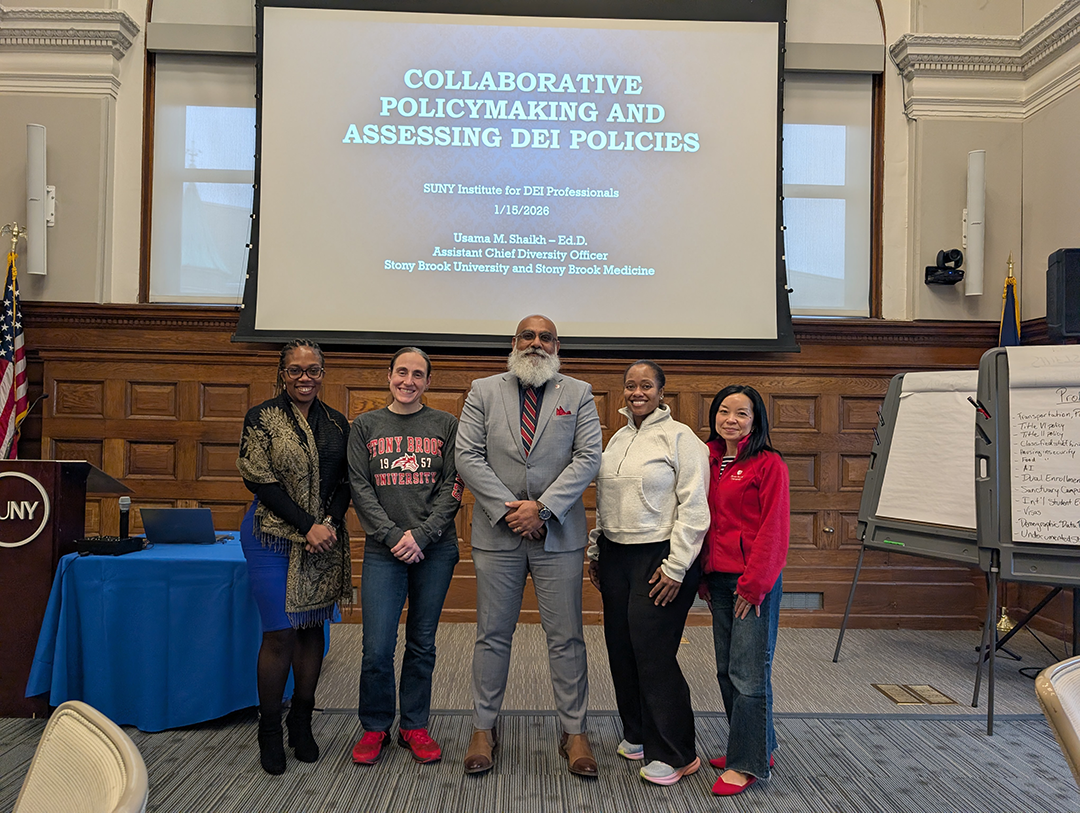 Faculty Collaborating for Inclusion and Belonging | Pictured from left: Members of the SUNY Institute for DEI Professionals—Lyndsay Johnson, associate director, Office of Financial Aid and Scholarship Services; Haylee Hebenstreit, SSW clinical instructor; Usama Shaikh, assistant chief diversity officer, Office of Diversity, Inclusion and Intercultural Initiatives and the Office of Health Equity and Climate Medicine Research; Jalana Harris, SSW clinical lecturer; and Thien Nguyen August, assistant director of enrollment communications, Office of Undergraduate Admissions—who are advancing SUNY’s commitment to equity, inclusion, and systemic change across the university system. | | | | |