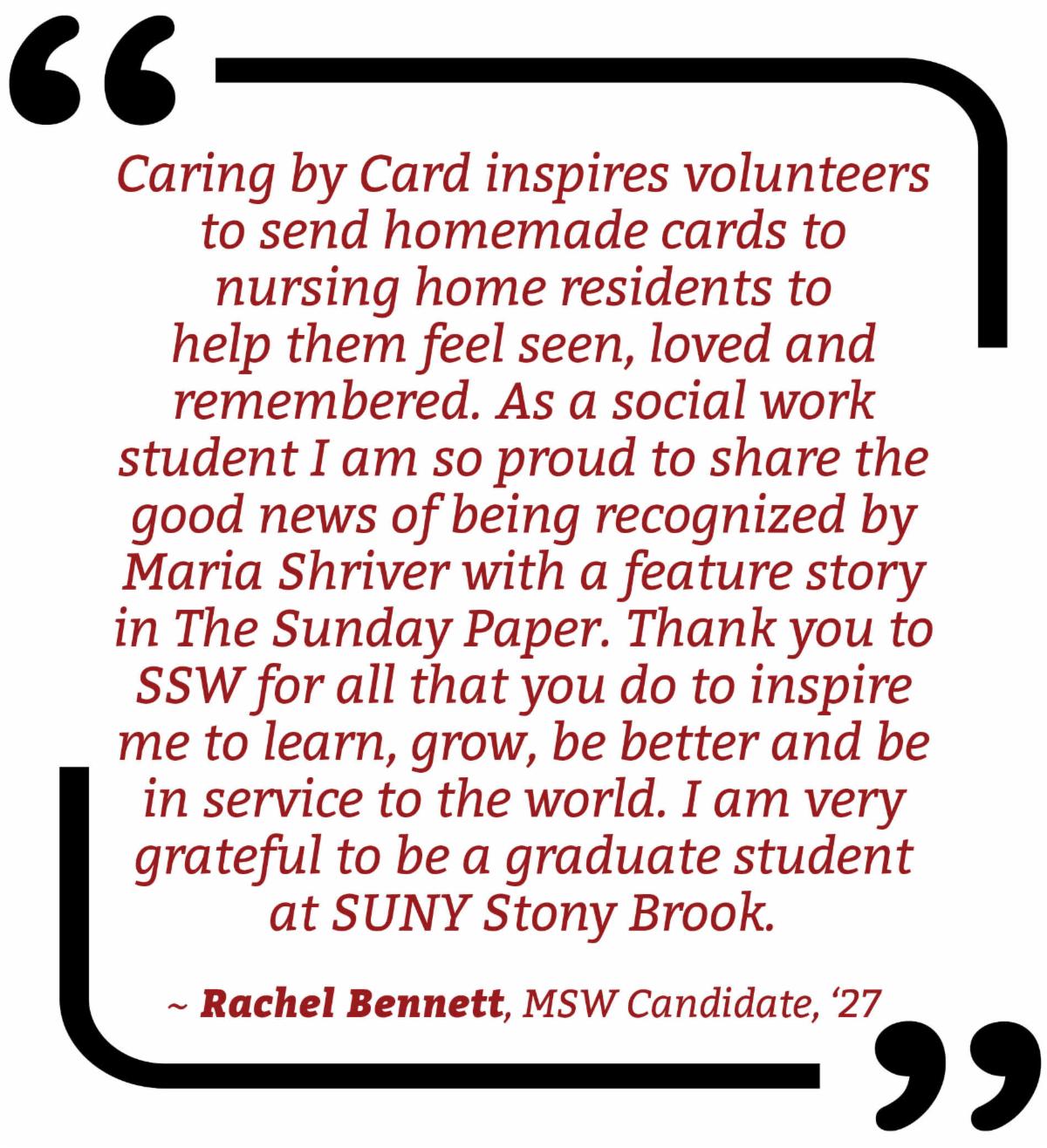 Rachel Bennett’s Caring by Card project was recently honored with a feature in Maria Shriver’s award-winning digital publication, The Sunday Paper. You can read the story here.