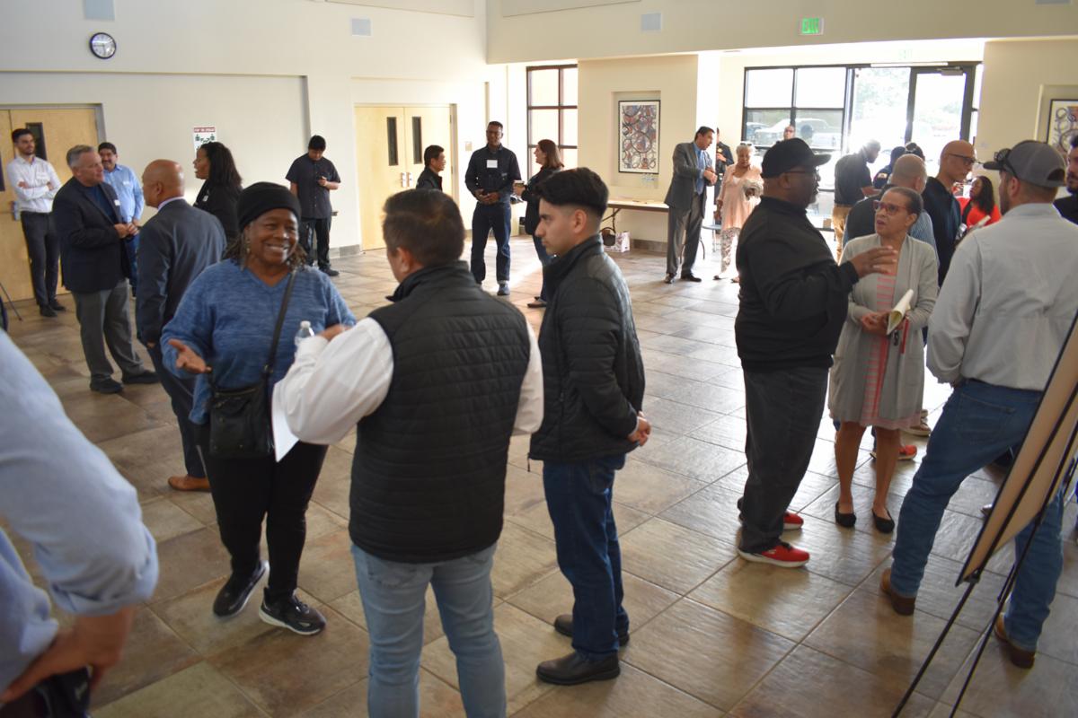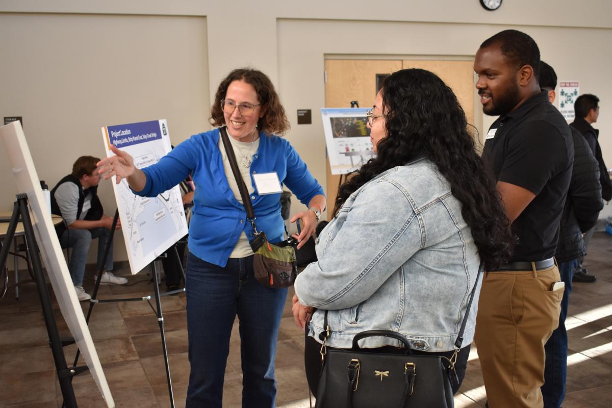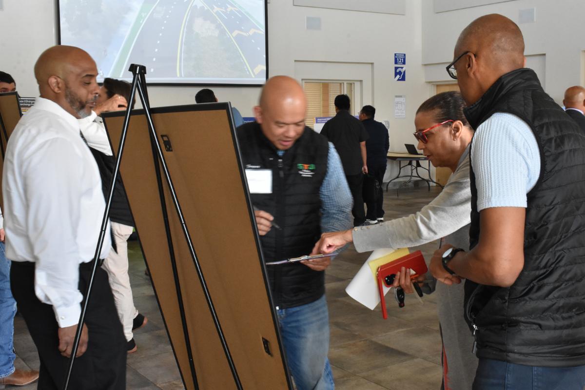 Project representatives were available at each station to present information and answer questions. Attendees engaged with visuals showing the project’s purpose, need, design features, schedule, and transit and active transportation connections, supported by posters like the “Purpose and Need,” “DDI Design,” and “Transit/Mobility Hub” boards.