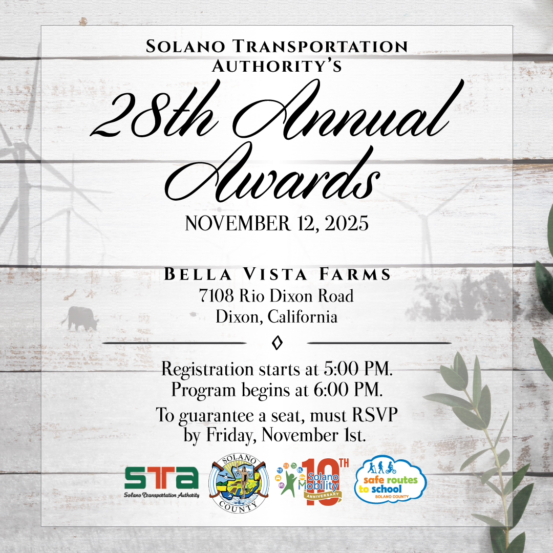 The STA’s 28th Annual Awards will be held on Wednesday, November 12, 2025, at Bella Vista Farms in the City of Dixon. The Award Ceremony will honor many individuals, agencies, volunteers, committee members, and projects that have been outstanding in transportation over the past year. The Awards Ceremony will include a multi-media presentation highlighting each of the nominees, award winners, and partnerships that are instrumental to the successful delivery of transportation mobility and safety projects in Solano County.