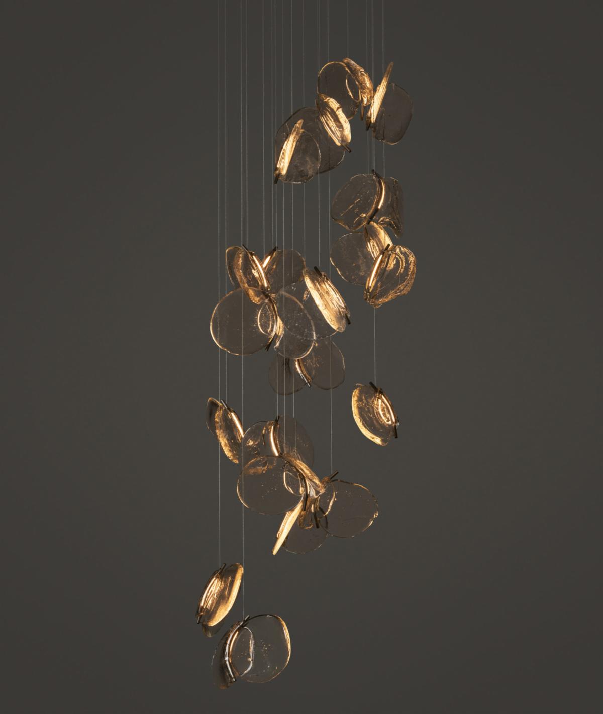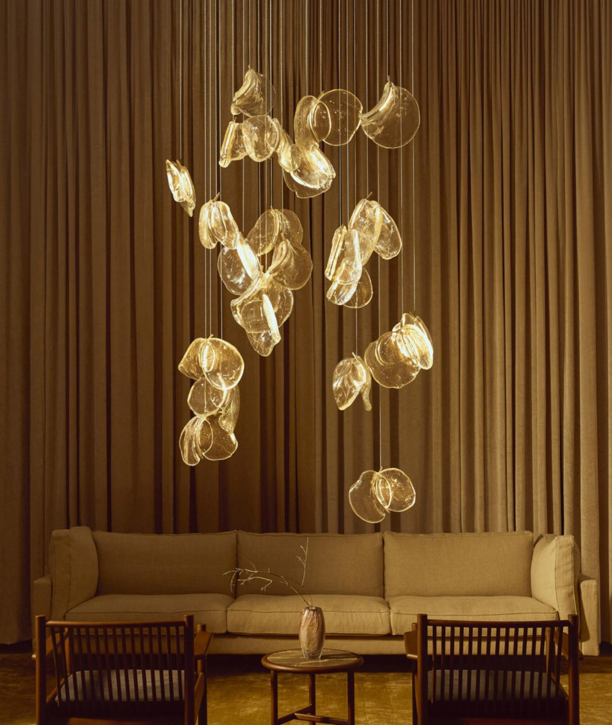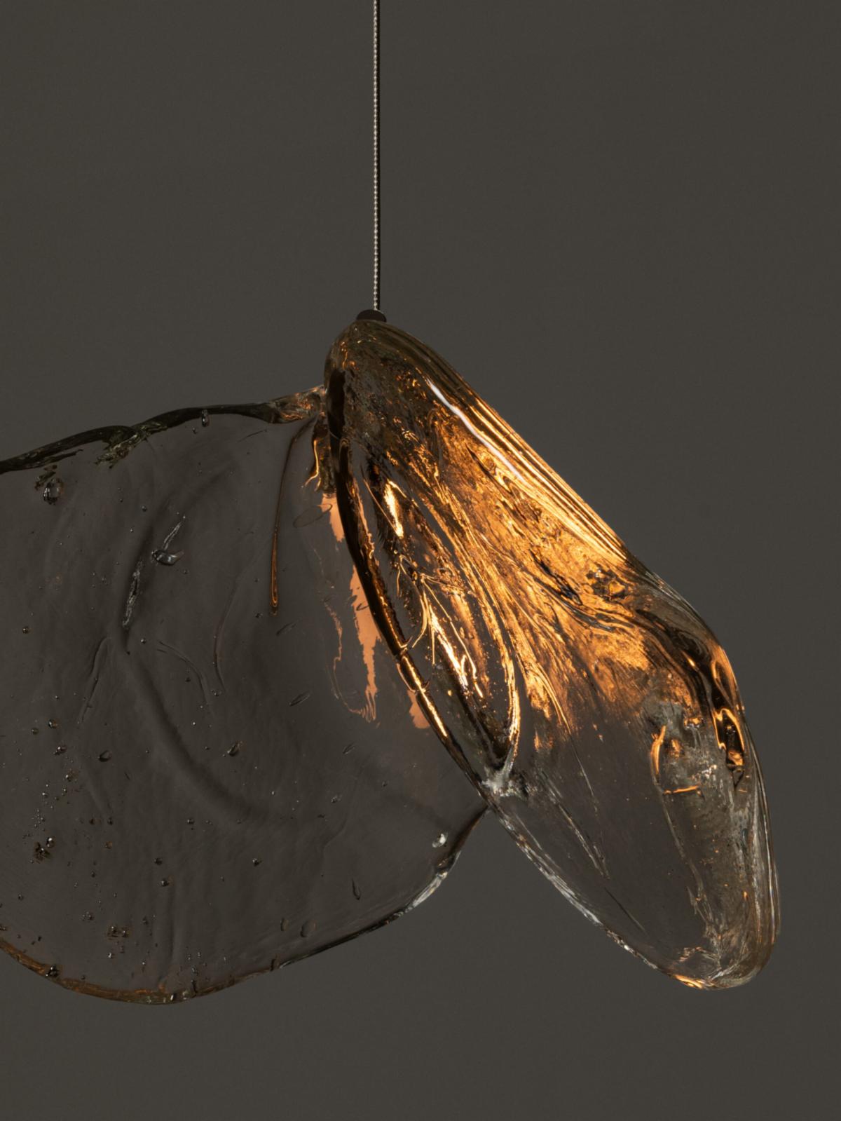 BOCCI'S EXCITING NEW 141 SERIES IS CRAFTED BY POURING TWO LADLEFULS OF HOT GLASS FREEHAND OVER A CURVED ROD TO CREATE TWO OVERLAPPING PUDDLES. THE ROD IS THEN LIFTED, AND THE PUDDLES WING OUT INTO AN UNPREDICTIBLE SHAPE IN A GESTURE THAT IS BOTH SIMPLE AND CINEMATIC AT ONCE.