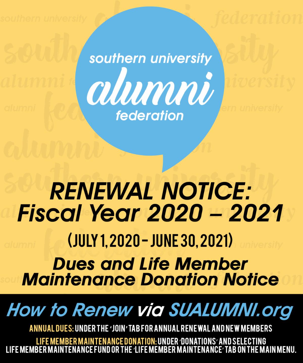 We greatly appreciate your support of the SUAF and Southern University as a whole. If you are not already a member, please consider joining or renewing. Go to ttps://www.sualumni.org/page/JOINPAGE1. Life Member maintenance donations can also be made on www.sualumni.org.
