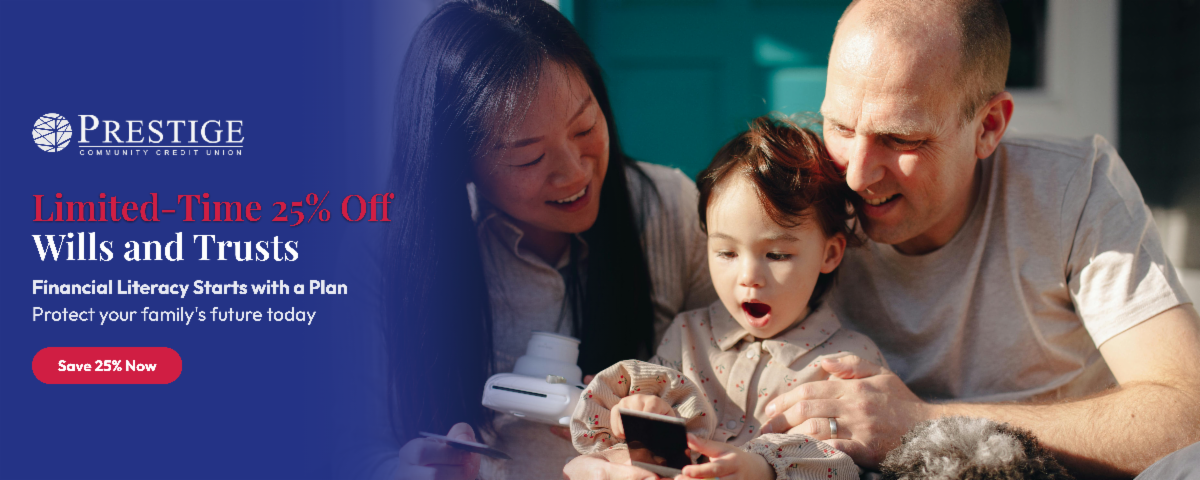 April is Financial Literacy Month, the perfect time to protect your family's future. As a valued member of Prestige CCU, you have access to an easy, affordable, and secure way to create your Will or Trust online - now with 25% off for a limited time*. Your discount will be automatically applied at checkout.