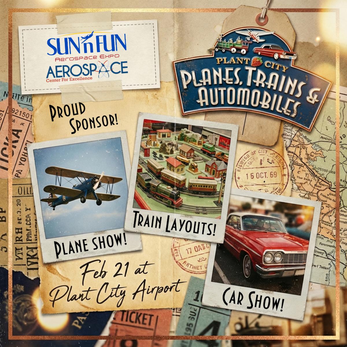 | | Daily Air Show Sponsored by: | | Twilight Night Air Show sponsored by: | Night Illumination Sponsored by: | | FLORIDA RESIDENTS! JOIN US AT PLANES, TRAINS & AUTOMOBILES - FEB 21! | | Join us Saturday, February 21st, at Plant City Airport for the 14th Annual Planes, Trains & Automobiles, a family-friendly showcase of aviation and transportation! Explore classic aircraft, cars, and trains up close, meet pilots and industry pros, and enjoy interactive STEM experiences that inspire all ages. Proceeds support local flight training and aviation scholarships. Parking is free, with VIP parking available online only for the closest access and no waiting in line. Advance tickets just $7.50 ($12.50 at the gate) and kids 10 and under are free! Learn more and get your tickets at www.planestrainsautospc.org. | | | | |