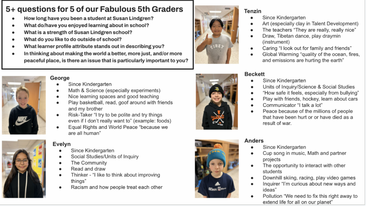 District IB PYP Coordinator Anne LaLonde Laux will be interviewing five fifth graders each week