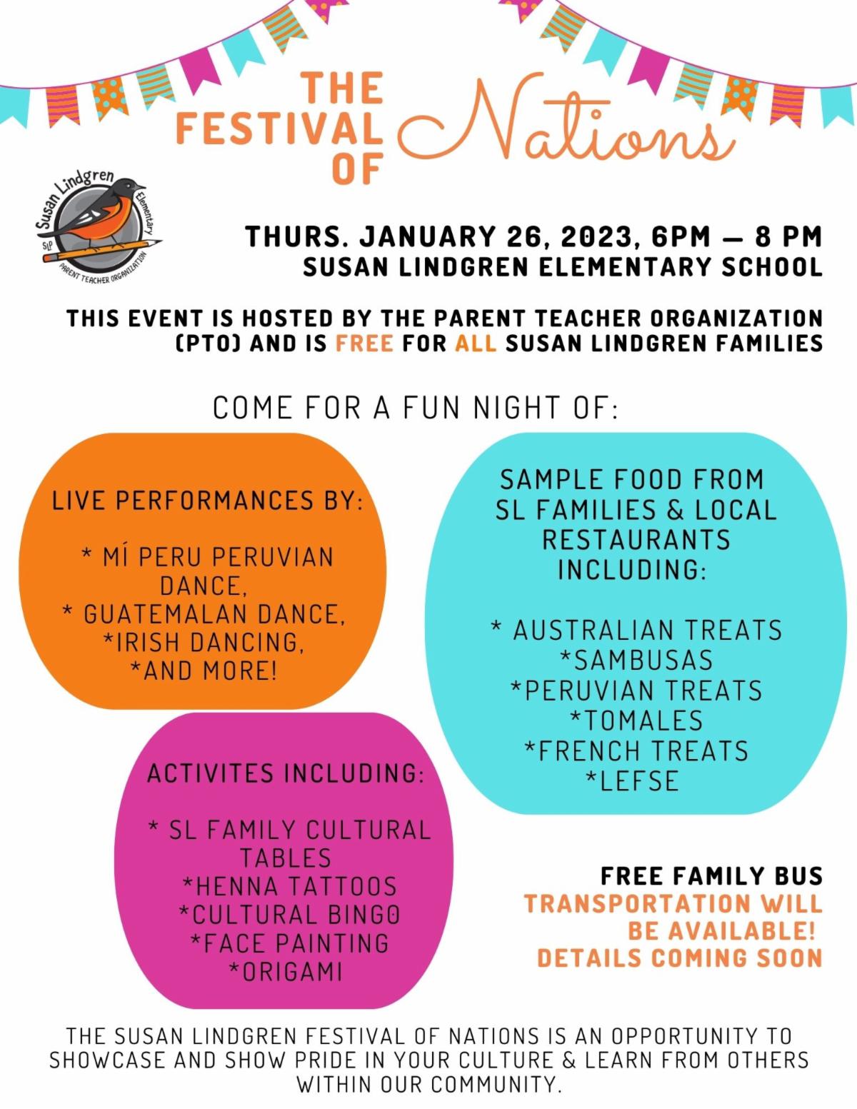 - Thursday, January 26- Festival of Nations- 6:00-8:00 PM at Susan Lindgren