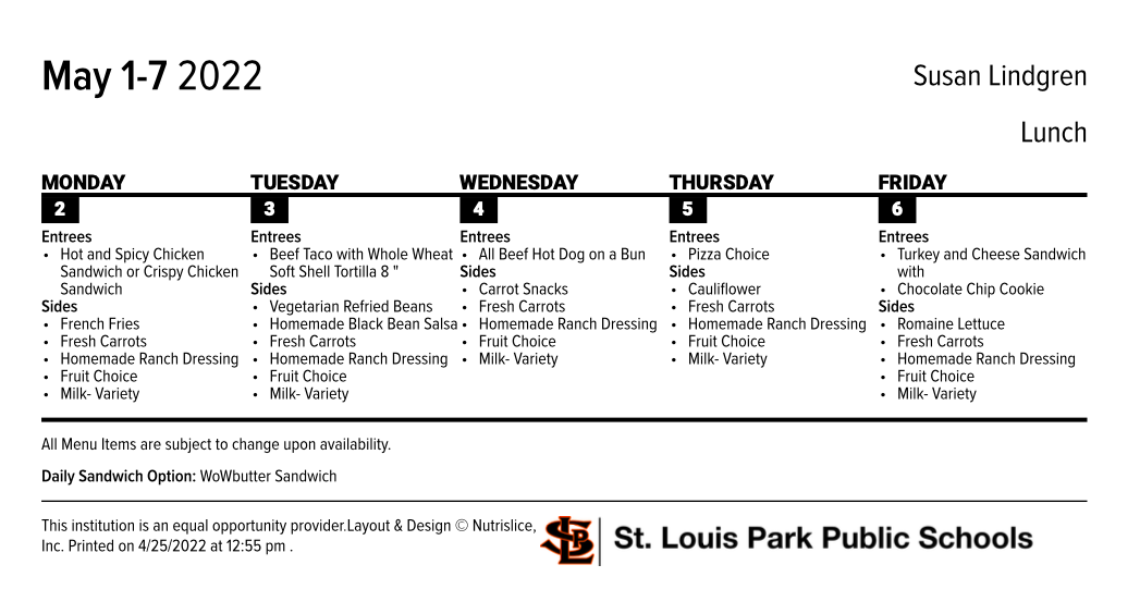 For the rest of the school year we will be sharing the lunch menu a week at a time, as we are experiencing supply and vendor issues that require our kitchen team to have to change the menu at the last moment. We very much appreciate your understanding as we continue to do everything we can to make sure our students nutritional needs are met.