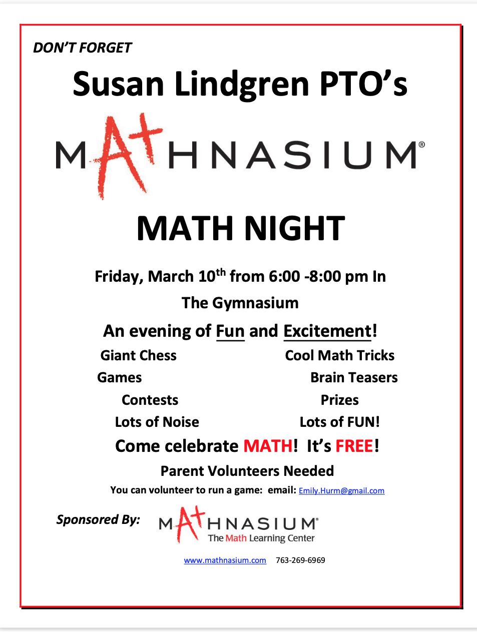 A big thank you to so many parents (and some older siblings!) who are volunteering for Math Night, tomorrow, Friday March 10, 6-8 p.m.! In partnership with Mathnasium, we are looking forward to a great night of games, prizes and FUN in the gym.