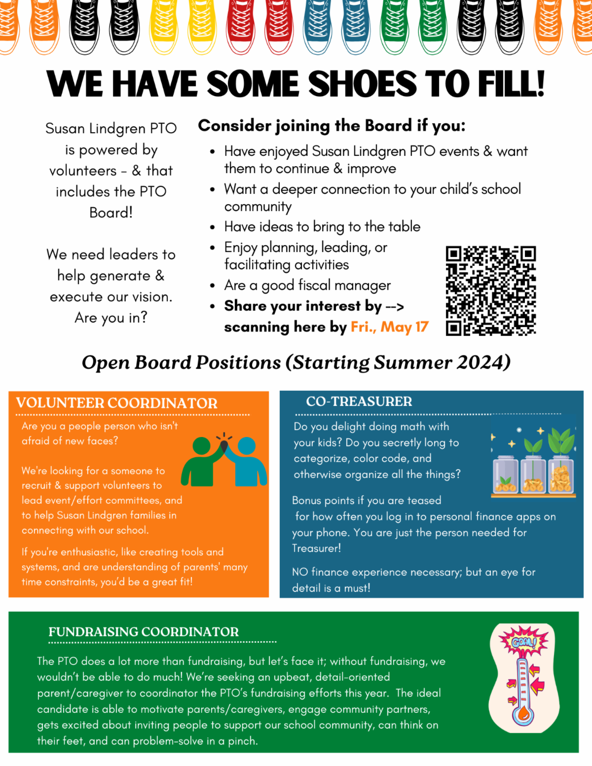 Submit your interest HERE by Friday, May 17! Questions? Email susanlindgrenpto@gmail.com
