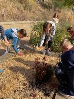 It was our last week in the garden this week. The kids were very busy harvesting lettuce, dill, sage, and cauliflower. We planted garlic and daffodils for the spring. They helped pull out plants today and spread straw over the garlic beds. Mrs. Bancroft’s class brought their own plants to add to the garden boxes on the hillside.