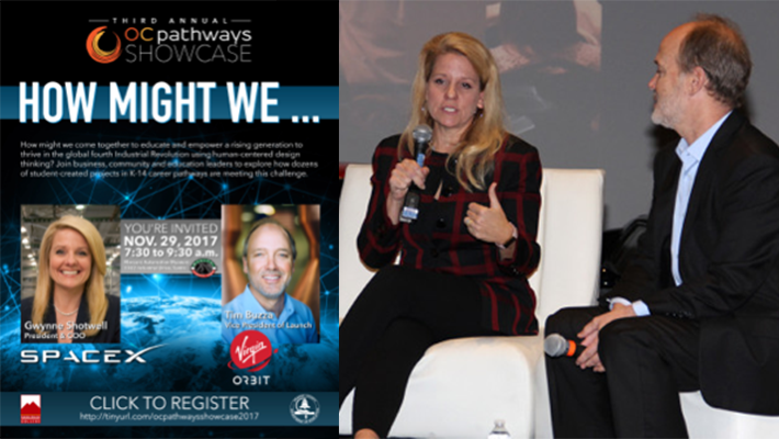 Featured speakers at this event were Gwynne Shotwell, President and Chief Operating Officer of SpaceX, and Tim Buzza, Vice President of launch Virgin Orbit. Led by OCDE and Saddleback College, the OC Pathways Initiative was initially funded through a state grant in 2014. The program blends rigorous academics with career preparation in the STEM-related industry sectors of engineering/advanced manufacturing, healthcare/biotechnology, and information and communications technology/digital media.