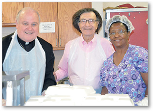 Bishop Robert W. Muench on left, St. Vincent de Paul Society lay leader, Rosie Martina, and SVdP kitchen supervisor, Denise Spears served volunteers who gathered for a celebration of the 35th anniversary of the SVdP Dining Room on July 28. Photo by Debbie Shelley | The Catholic Commentator