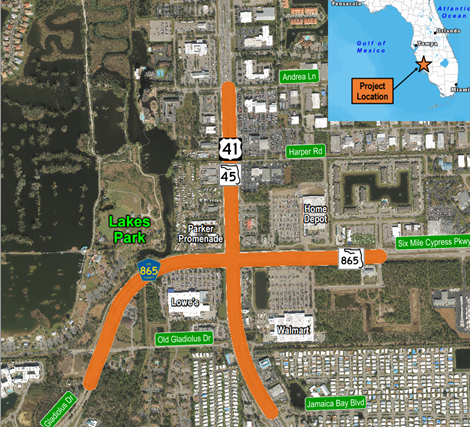 Currently the intersection is experiencing congestion resulting in long queues. It serves major retailers, Walmart, Home Depot and Lowes and is located close to the entrance of Lakes Park, a major local attraction. The project is being considered to alleviate traffic congestion and improve intersection safety. According to FDOT records, between July 1, 2019 to June 30, 2024 crash data at the intersection resulted in: