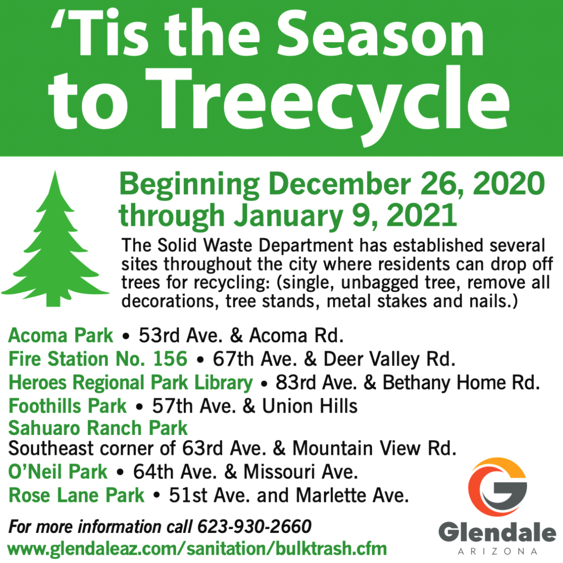 70th Avenue/Grandview Road, north of Bell Road – Royal Palm Road, 59th Avenue to 63rd Avenue – Slurry Seal application was originally scheduled to take place this month but has been postponed to Spring 2021 due to excessively cool morning temperatures predicted when work was originally scheduled to take place.