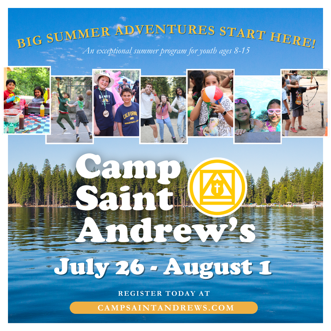 Join Camp Saint Andrew’s for a week filled with outdoor adventure, friendship, and personal growth in the Sierra Nevada Mountains! Open to youth ages 8–15, our traditional overnight camp offers activities like archery, swimming, fishing, arts & crafts, hikes, sports, and campfire skits and songs. We focus on building leadership skills and fostering personal and spiritual growth in a supportive community. Visit campsaintandrews.com to learn more and register. Counselor opportunities for responsible young adults are also available. Space is limited—register today!