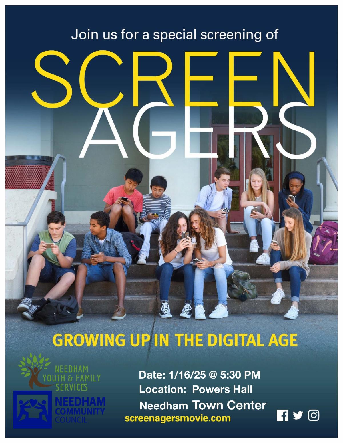 Join us for a special screening of the acclaimed documentary "Screenagers: Growing Up in the Digital Age" THIS Thursday, January 16, 2025, at 5:30pm at Powers Hall (Needham Town Hall).