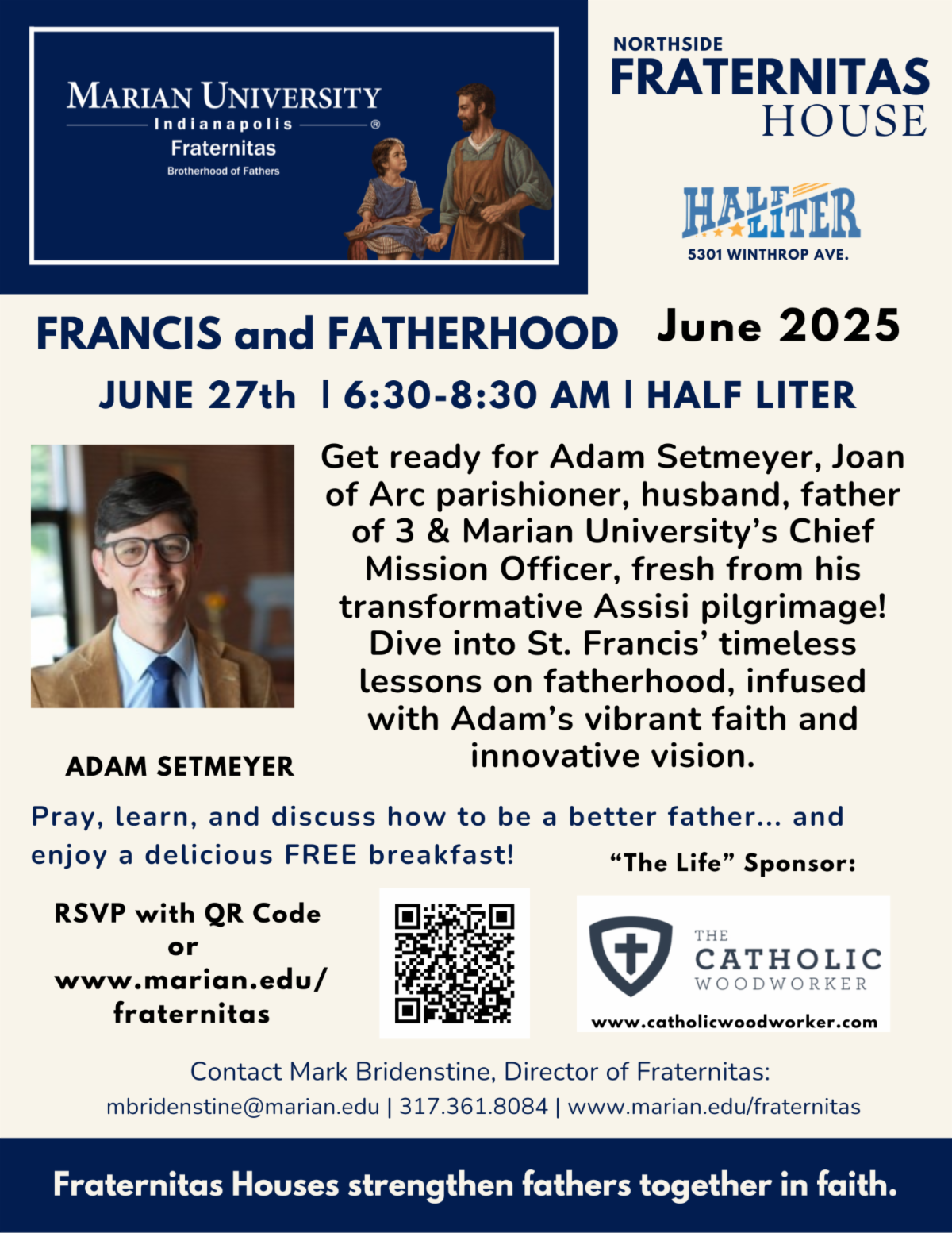 Northside Fraternitas House. Join other men of St. Matthew and the north deanery for a breakfast event at Liter House in Broad Ripple on Friday, June 27th, 6:30 am-8:30 am. Get ready for Adam Setmeyer, Joan of Arc parishioner, husband, father of 3 & Marian University's Chief Mission Officer, fresh from his transformative Assisi pilgrimage! Dive into St. Francis' timeless lessons on fatherhood, infused with Adam's vibrant faith and innovative vision. Pray, learn, and discuss how to be a better father... and enjoy a delicious FREE breakfast! The mission of Fraternitas is to help dads pass on their faith to their families. Hosted by Marian University. Please RSVP HERE!