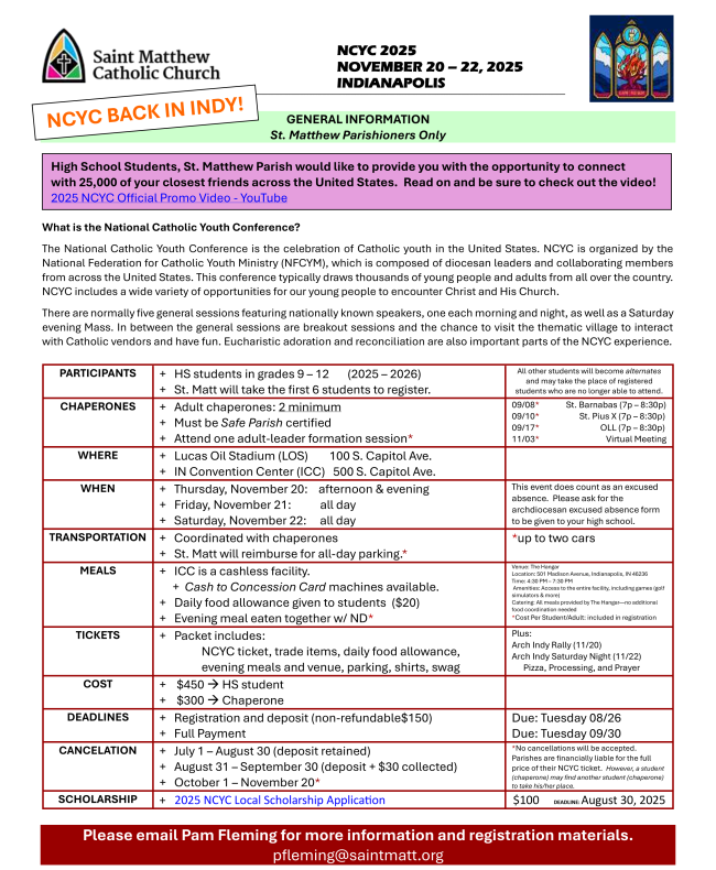 Open to: St. Matthew students/parishioners (grades 4 through high school for the 2025-26 school year)