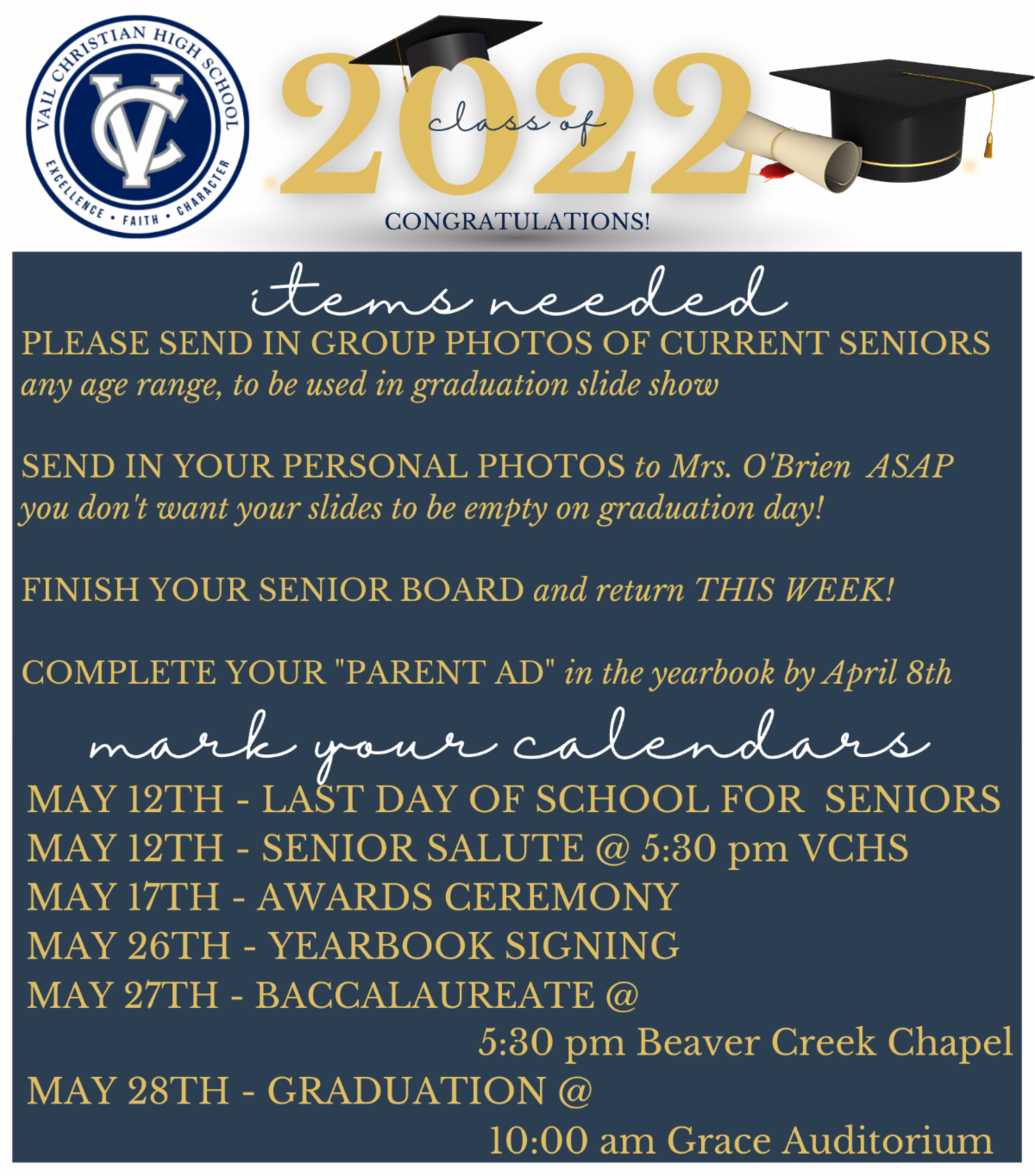 - May 12 Senior Salute (and last day of classes for Seniors)
