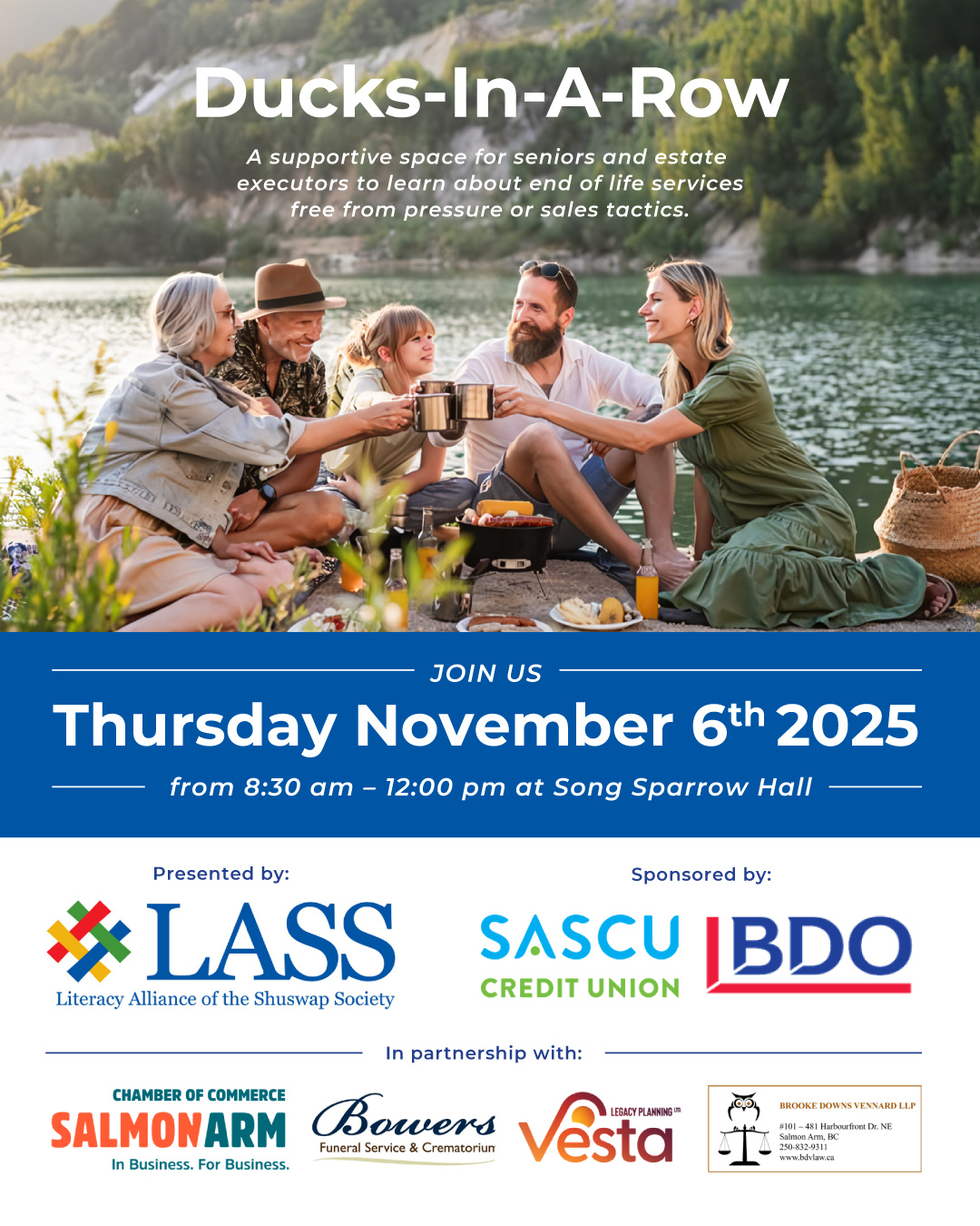 Join us at SongSparrowHall on Thursday, November 6th from 830am to 12p, for Ducks in a Row, a free community session offering practical advice from trusted local professionals in finance, law, and funeral planning.