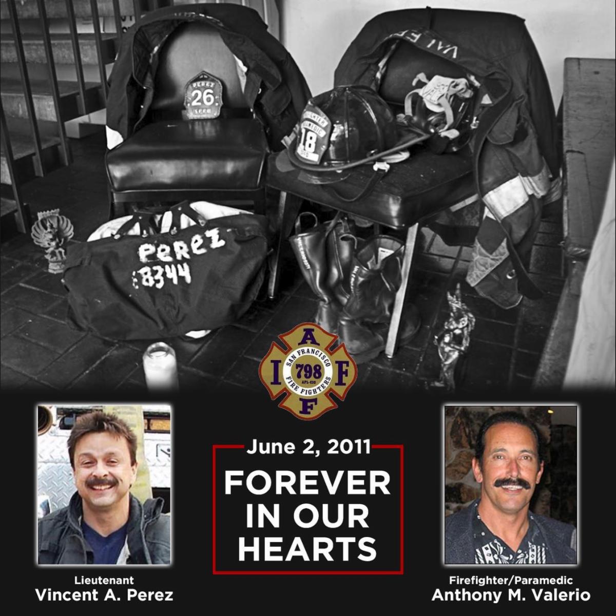 On June 2, 2011, we lost two San Francisco Fire Department heroes during a structure fire at 133 Berkeley Way. SFFD Lieutenant Vincent A. Perez and Firefighter/Paramedic Anthony M. Valerio will always be remembered by San Francisco Firefighters Local 798 as we honor the 10-year anniversary of their tragic passing. “Brothers Perez and Valerio were the very best of the best. Two Firefighters who didn’t hesitate one second while attempting to save lives and property during this structure fire that ultimately took their lives. May their memories continue to serve as a blessing to all who knew them and may the City continue to honor their ultimate sacrifice on behalf of the people of San Francisco.” -Shon Buford, President of San Francisco Firefighters Local 798