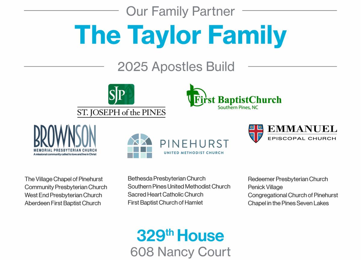 Since its start in the Sandhills as an ecumenical Christian ministry, Habitat for Humanity has engaged the local faith community. Some churches are moved to partner with our Aging in Place program, helping to fund and volunteering to build wheelchair ramps or providing other critical home repairs for elderly or disabled community members. Many choose to focus their investment of time and treasure through our Apostles Build, now held every spring. This build aims to gather 12 churches or coalitions of churches to offset some of the cost of one home built annually. Additionally, churches provide volunteer helpers in the actual building process.