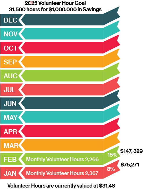Wow! Even through snow, ice, and rain, our volunteer team managed to make another significant contribution to our volunteer challenge. We collectively thank all of you for your valuable time! You make a difference in our mission, whether swinging the hammer, working the ReStore register, or tallying the books in the office. Please invite your neighbors, friends, family, and coworkers to join us this year. Together, we can do more for our community.!