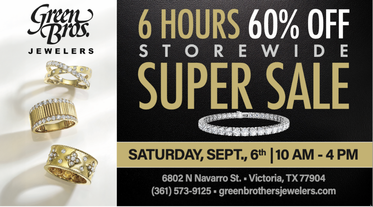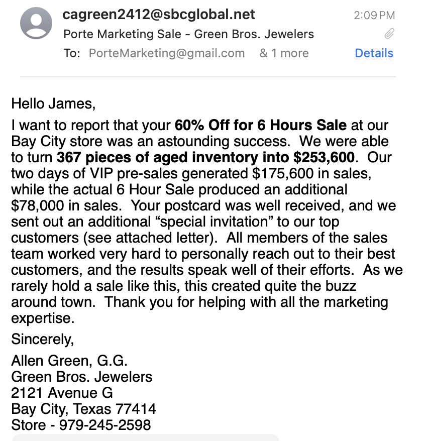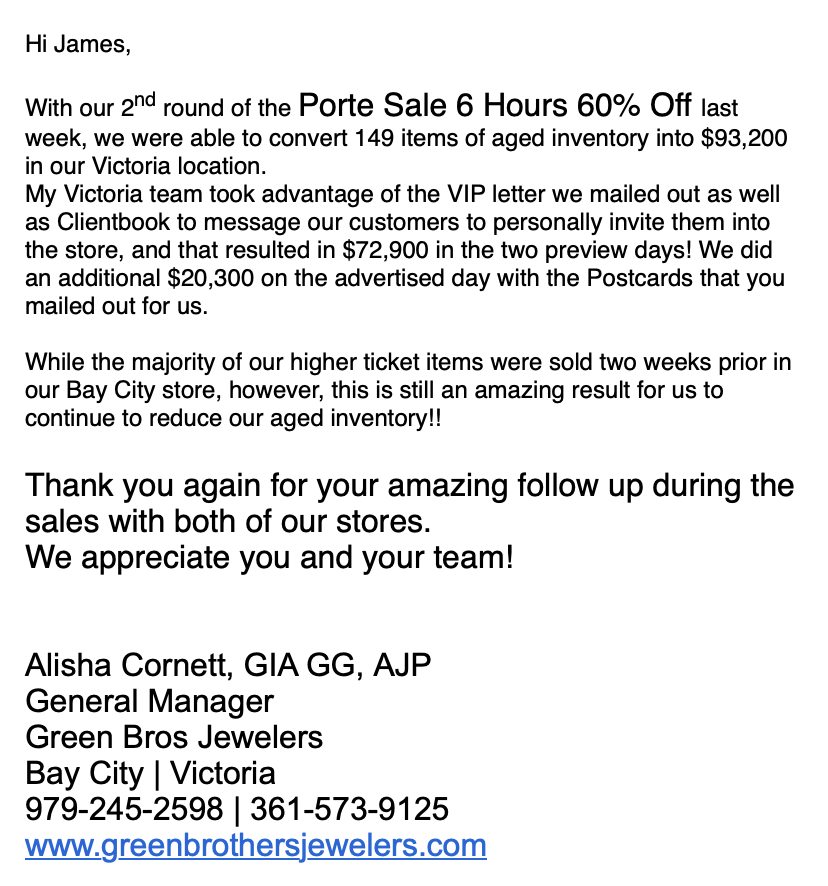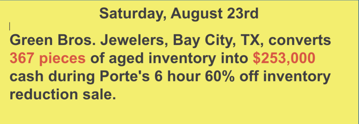 Green Bros. Jewelers, Victoria, TX, converts 149 pieces of aged inventory into $93,200 cash during Porte's 6 hour 60% off inventory reduction sale. Their Bay City location turned 367 pieces of aged inventory into $253,600 cash two weeks earlier.