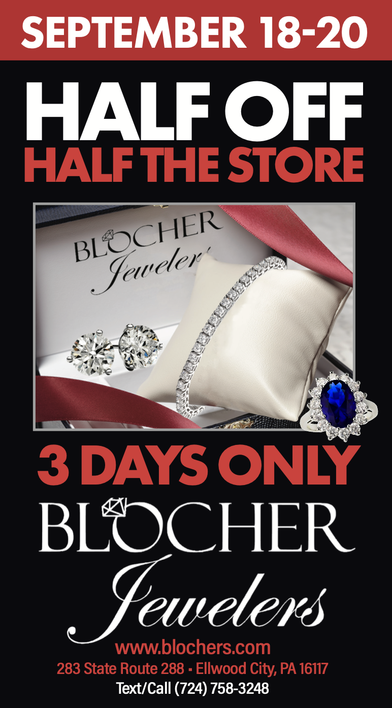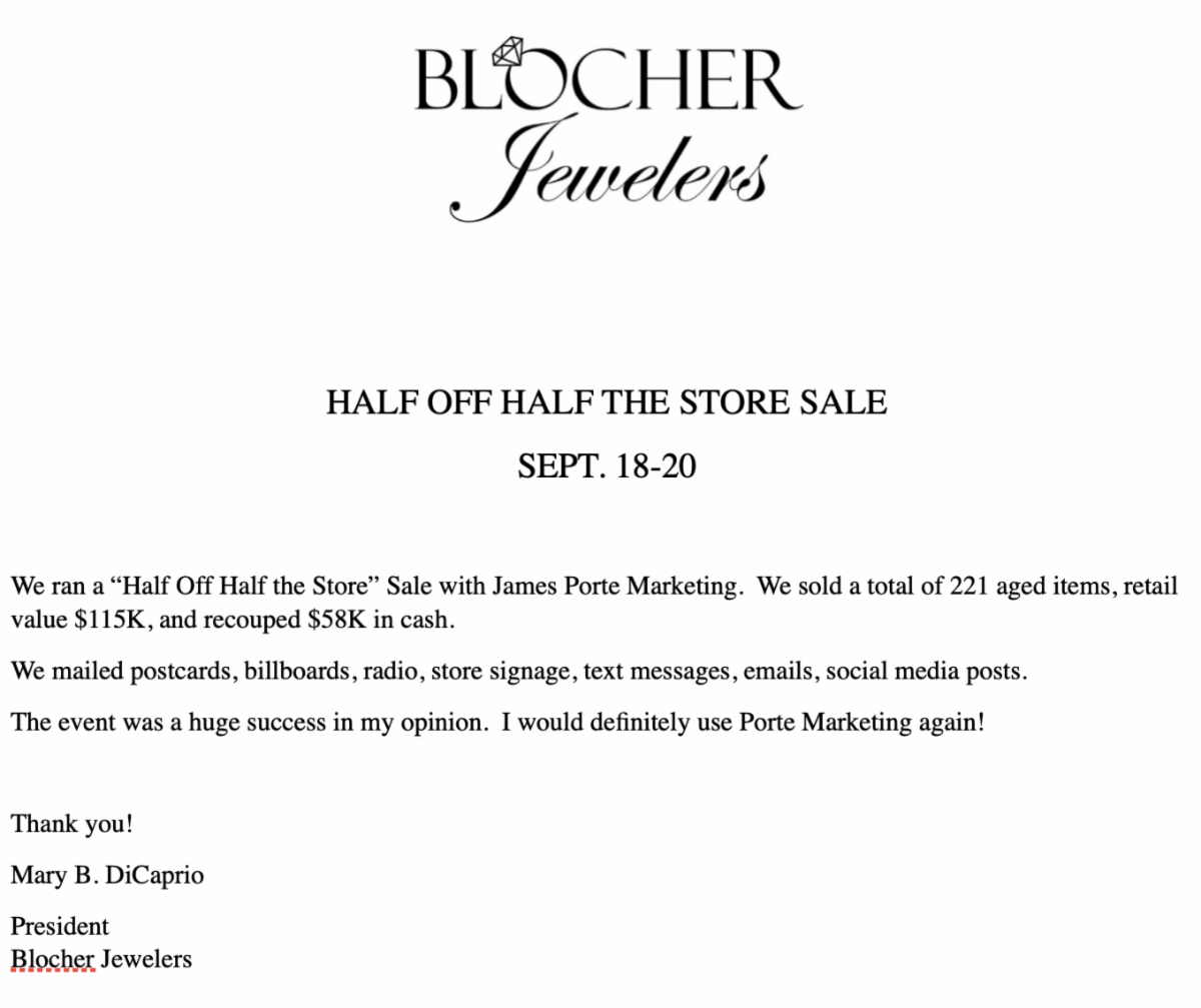 Blocher Jewelers, Ellwood City, PA. converted 221 aged items into $58,000 cash with Porte's Half Off Half the Store inventory reduction event. The store is headed for the highest sales in 118 years (since 1907). Blocher Jewelers experienced consistent and steady sales and traffic for 3 consecutive days.