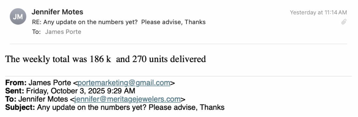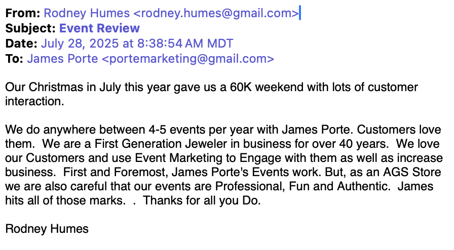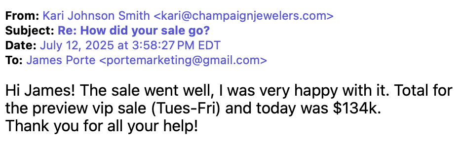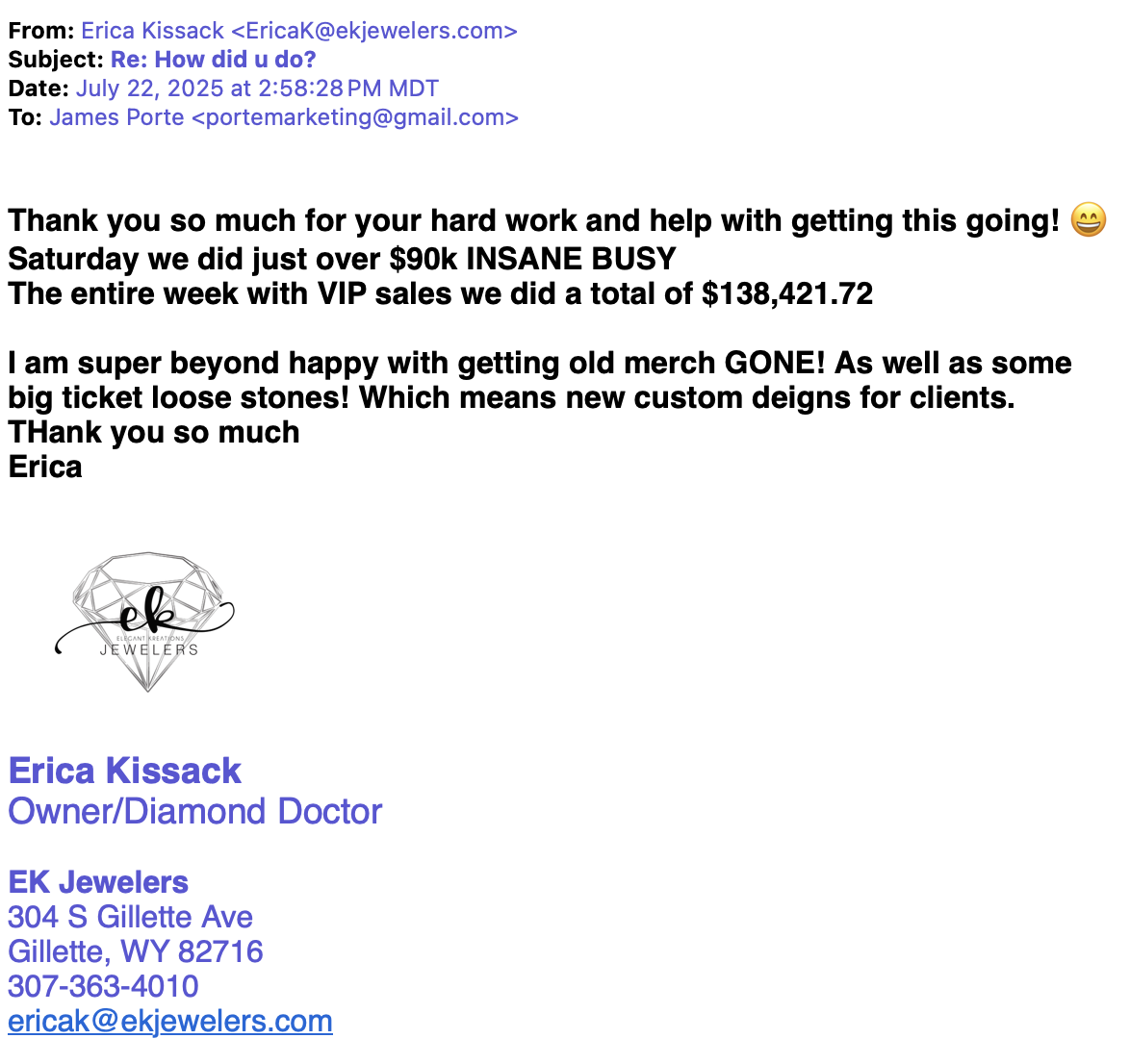 Jim Bartlett Fine Jewelry, Longview, TX, sells $124,800 of aged inventory during Porte's 6 hour 60% off inventory reduction event.
