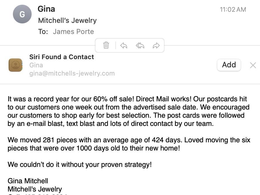The total cost of Porte's program was only $2684 and that included: Postcard (4" x 6") printing, mail prep, postage, social media package and robo calls. Sutton Jewelers has done this same program 5 years in a row.