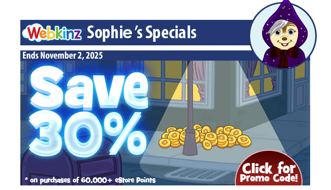 * Until November 2nd, 2025, save 30% on purchases of 60,000 eStore Points or more with promo code SPOOKTACULAR. Offer cannot be transferred or redeemed for cash. Purchasers must be over the age of 18 years old and have a valid credit card to purchase. **Until November 30, 2025, get Free items with select purchases of 33,000 eStore Points or more. Offer cannot be transferred or redeemed for cash. Purchasers must be over the age of 18 years old and have a valid credit card to purchase. *** Only one of the ads in the email will take you to the page where the hidden code is. Feature Code must be redeemed in the Code Shop inside Webkinz by April 30 2026. |