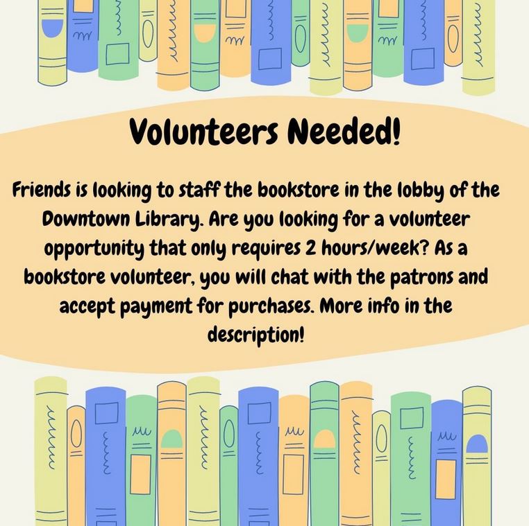 Are you looking for a volunteer opportunity that only requires 2-hours per week? As a bookstore volunteer, you will chat with customers and accept payment for purchases. All sales fund library programs such as Summer Learning Challenge and many Makerspace events.