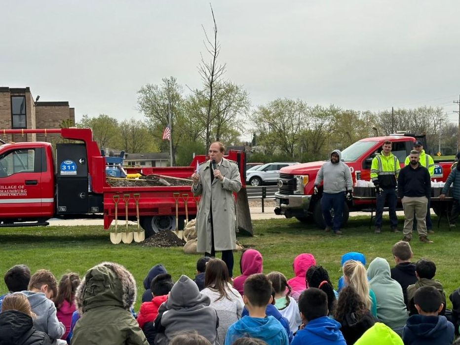 On April 26, Village President Tom Dailly and village officials celebrated Arbor Day alongside nearly 160 students and teachers from Hale Elementary School. Mayor Dailly and village Forester Frank Calvello spoke to students about how trees help create healthy communities. Afterward, staff from the village’s Engineering and Public Works Department planted a new tree on the school’s property with the helping hands of several students. Each student was sent home with their own sapling to plant at home.