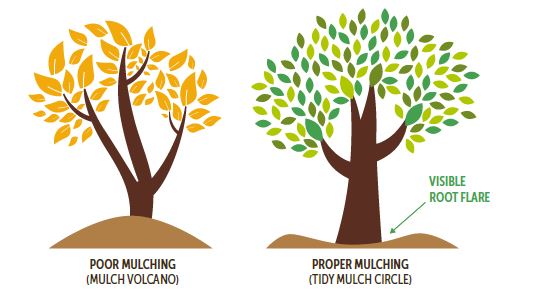 - Avoid creating a mulch volcano. Covering the root flare at the base of the trunk with mulch can cause stress to the tree or plant, leading to root rot and other issues.