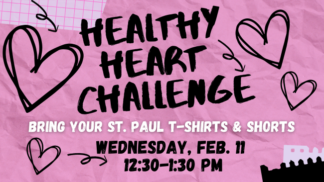 Bring your athletic shorts and St. Paul spirit wear for the Healthy Heart Challenge athletic activities on February 11, 2026 from 12:30-1:30 p.m. Your student will be able to change at school before the activities begin.