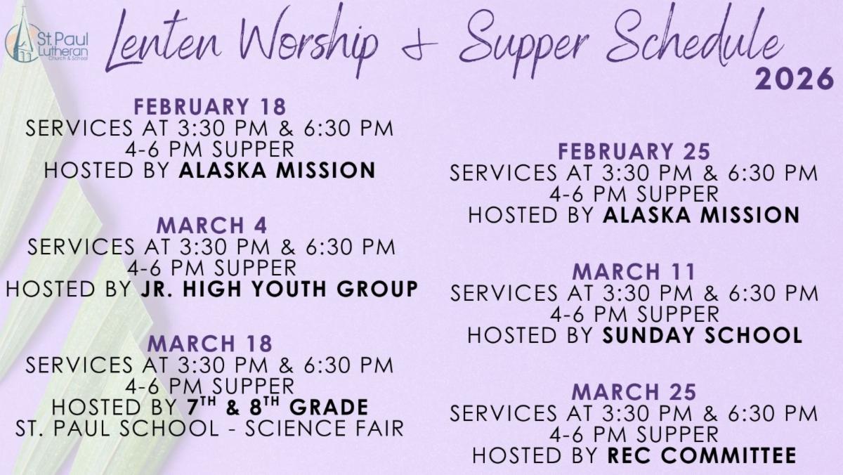 | | St. Paul Lenten Worship & Supper Schedule | | | | Join us for worship and supper this Lenten season. | | | | |