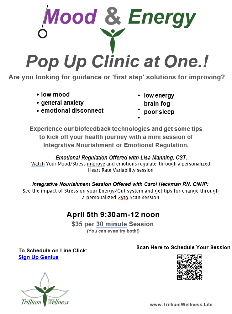 No fooling around today, One. is committed to bringing you the best and brightest folks in the wellness arena from our area right to our studio! On April 5th, we are hosting the gals from Trillium health from 9:30 AM- noon. Sign up for a 30 min spot for on sight testing to see how you are doing on your wellness journey. Lisa and Carol will offer you real time tips to improve your health in simple ways.