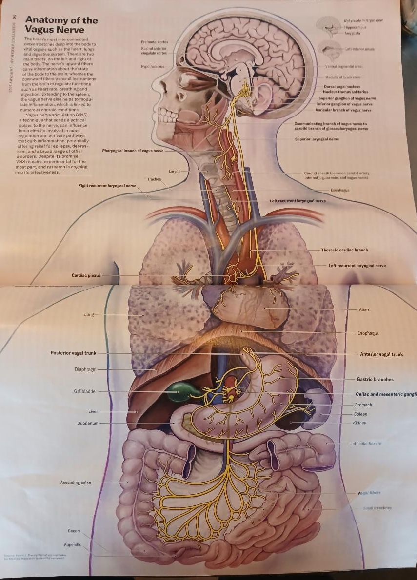Literally controls our nervous system from our brain to our diaphragm to our gut, this is why breathing using your diaphragm is so important for lowering blood pressure and reducing anxiety. Try exhaling through your nose for 6 seconds throughout your day.