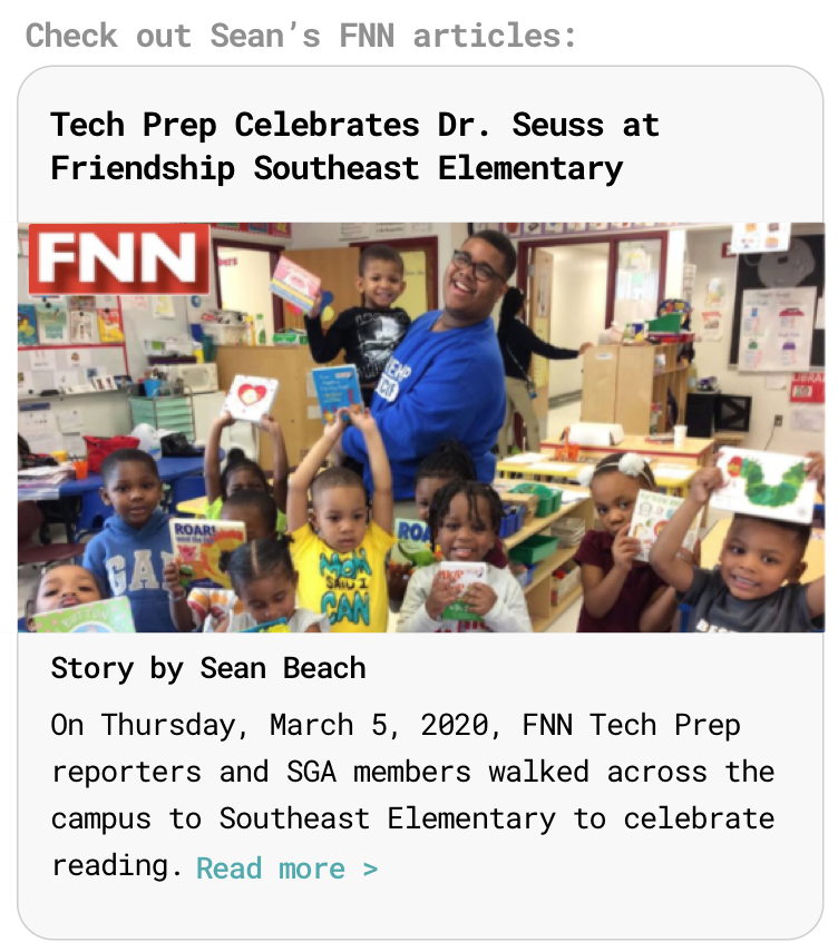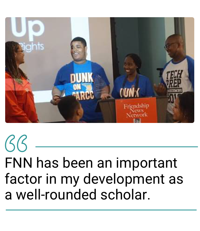 I am a part of the Friendship News Network (FNN). I have participated in FNN for 10 years and I love it. I’ve been the Editor-in-Chief for eight years. I’ve been able to develop as a better writer and overall journalist. FNN is the first place where I’ve really been a leader, and I truly appreciate it. Through FNN, I’ve gone on several different trips – to New York City, New Haven, CT, and one of the most important, Flint, Michigan to learn about the Flint Water Crisis and deliver water to the International Academy of Flint. FNN has been an important factor in my development as a well-rounded scholar because I’ve been able to learn the true meaning of journalism and leadership combined. Also, working with Ms. Kaufman, the Director of FNN, has been a great pleasure. She really cares about applying journalism to the 21st century and creating new ways for us to do it. Lastly, FNN has become my first real job – I am now the Intern Assistant to the Director and have been for over a year now. I’ve been able to apply a lot of my hidden talents while working with the other staff and students of FNN.