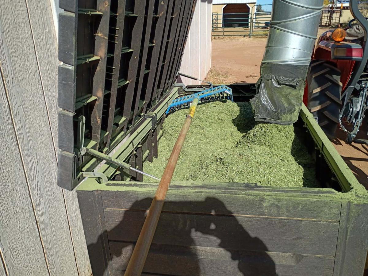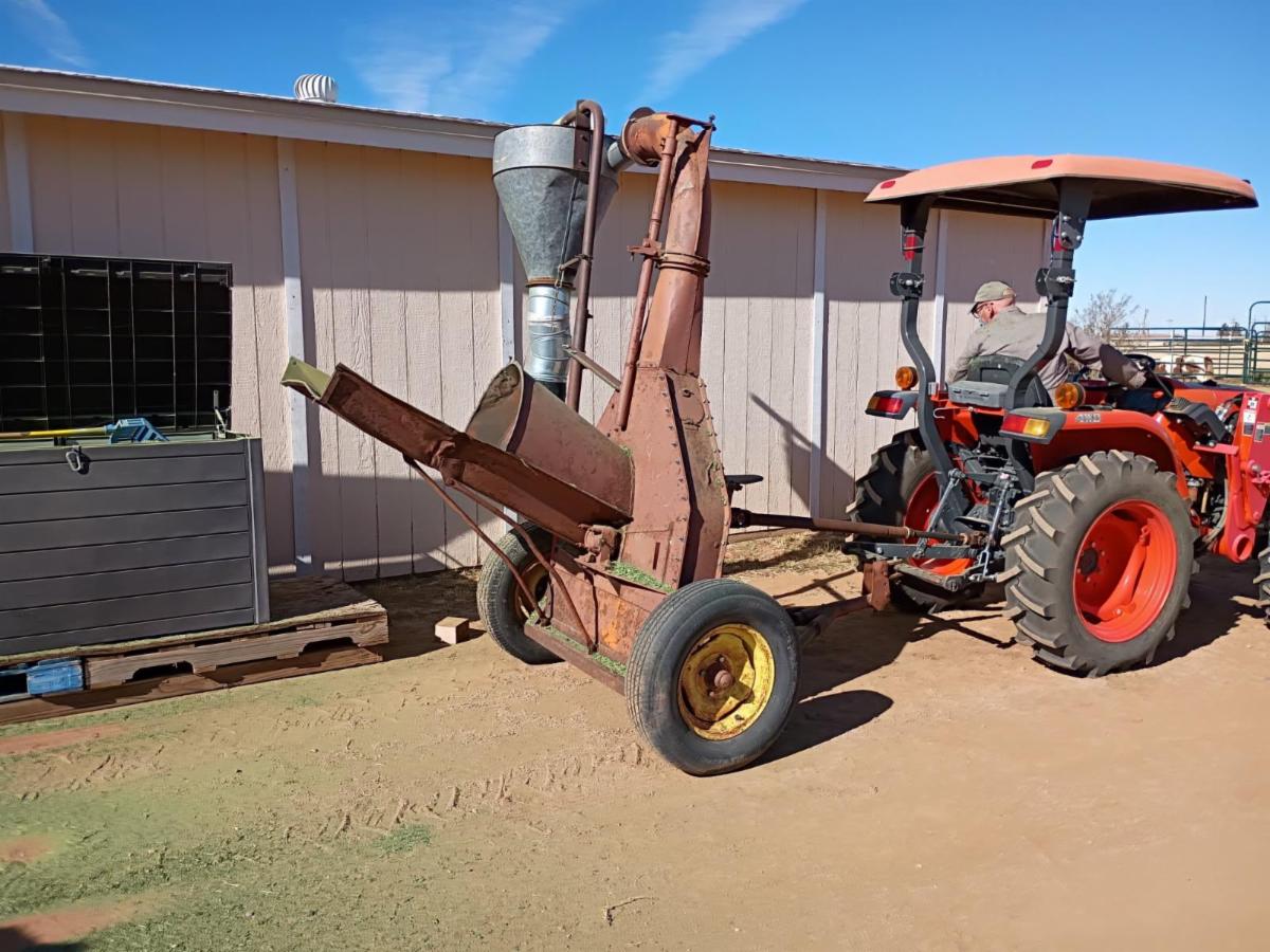 | | Our most recent intake is "Hope". A grade mare, in her 30's... an estray. Her teeth were horrid, the dental work has made her comfortable, but she has no molars. There are signs that she is prone to allergies. Her ears are full of calluses and her eyes weep. She will stay in a fly mask & will need one with ear mesh. | | So, Hope will need chopped, soaked alfalfa hay the rest of her life. | | We brought the hay chopper from DH1 to DH2. Thank goodness we have it! | | |