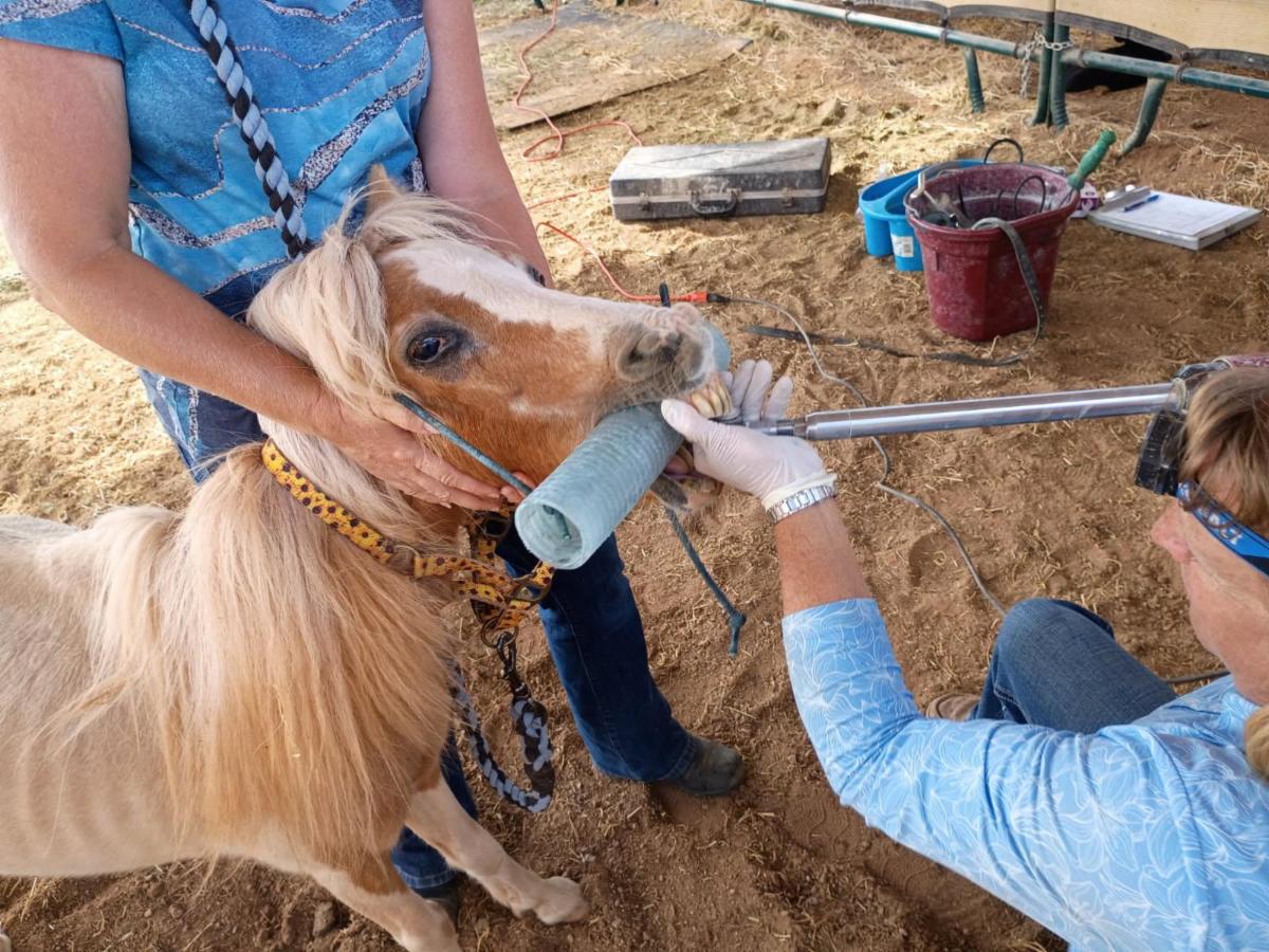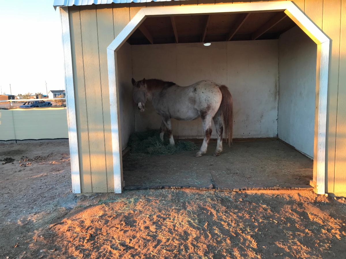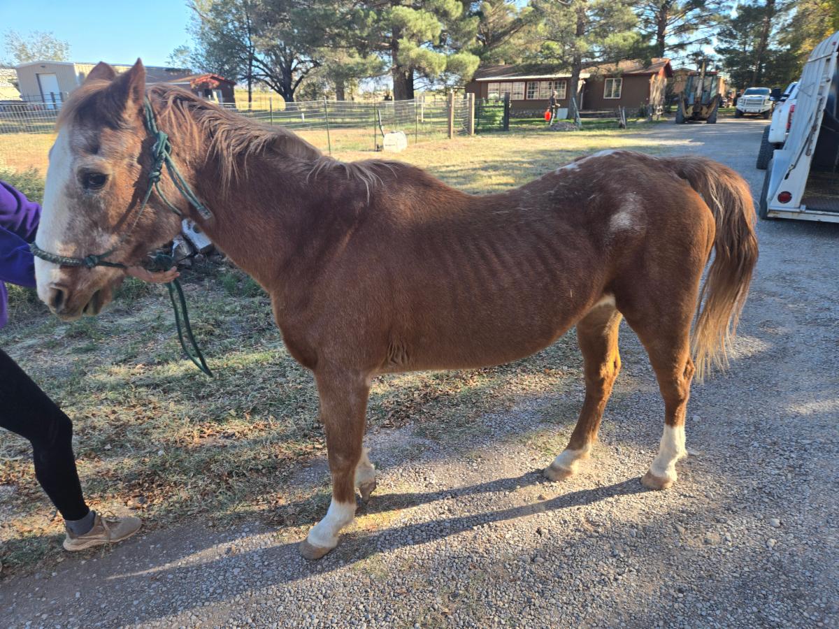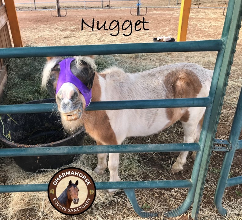 Our next intake, in September, was a tiny mini-stallion we named "Nugget". He was an estray. His teeth were a disaster, he was starved, had Habronema infection in his eyes and an injured penis... and, he is in his 30's!
