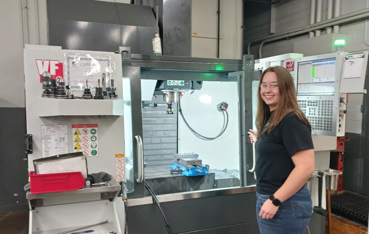 Machinist Greta Pallow, a high school senior (!), saw an opportunity to move one of our HAAS mills to accommodate an extended chip conveyor to be installed on a new Milling center.