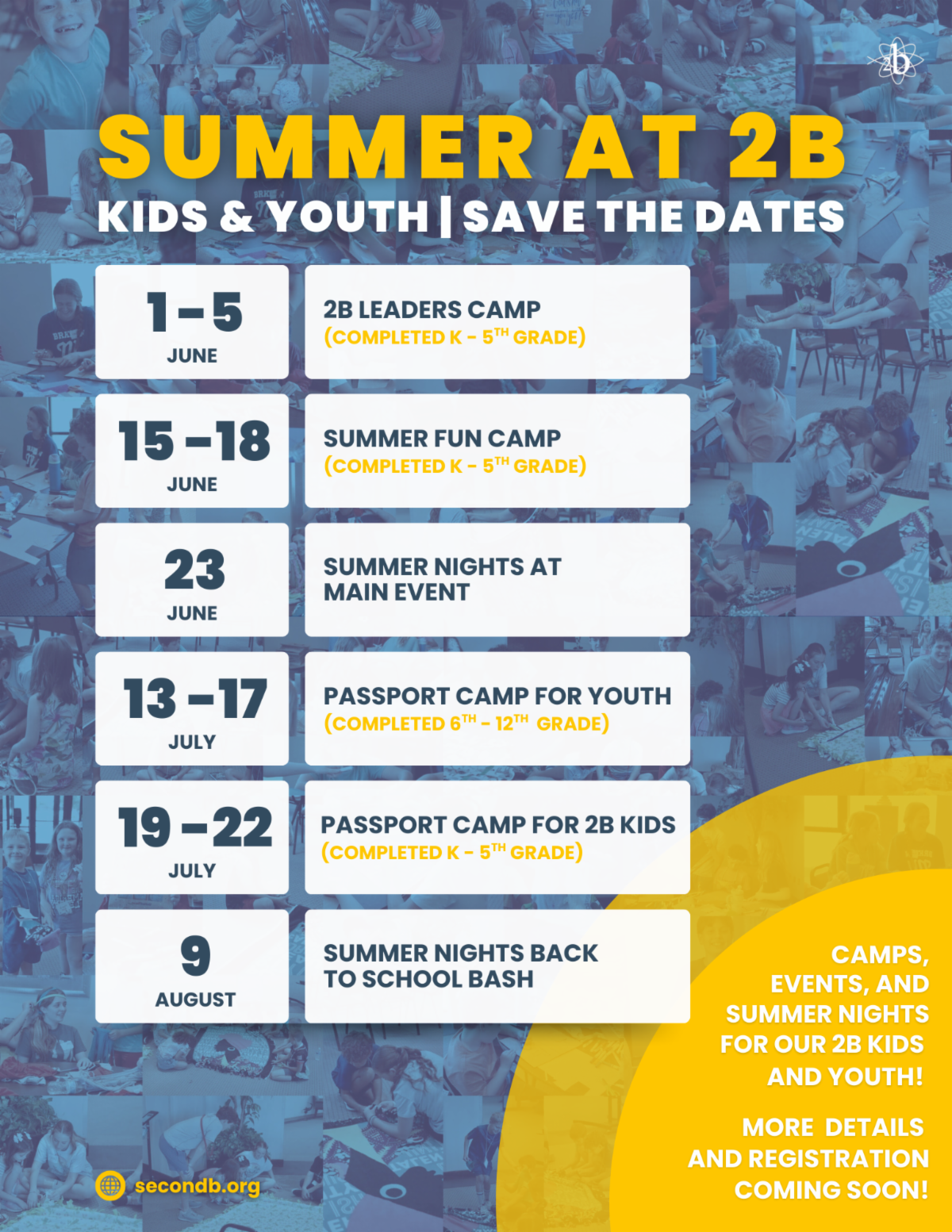 We’ve created private Facebook groups just for parents of 2b Kids and 2b Youth! These groups are the best way to stay up to date with photos, reminders, event details, and all that’s happening in our ministries throughout the year.