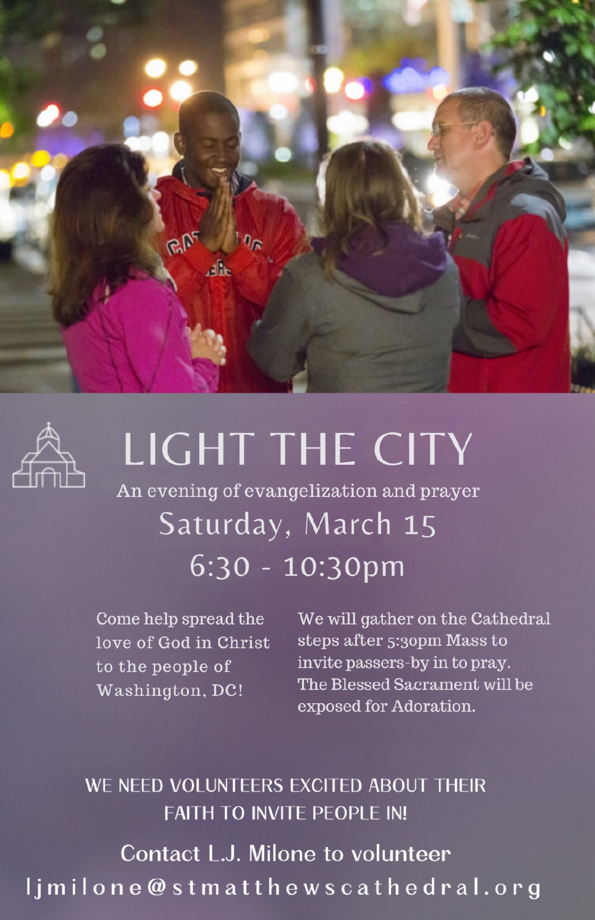Come help spread the love of God in Christ to the people of Washington, DC, at this evening of evangelization and prayer on Saturday, March 15, 2025! After the 5:30pm Vigil Mass, parishioners will gather on the steps in front of the Cathedral to invite passers-by in to pray. At the same time, the Blessed Sacrament will be exposed on the main altar for adoration.