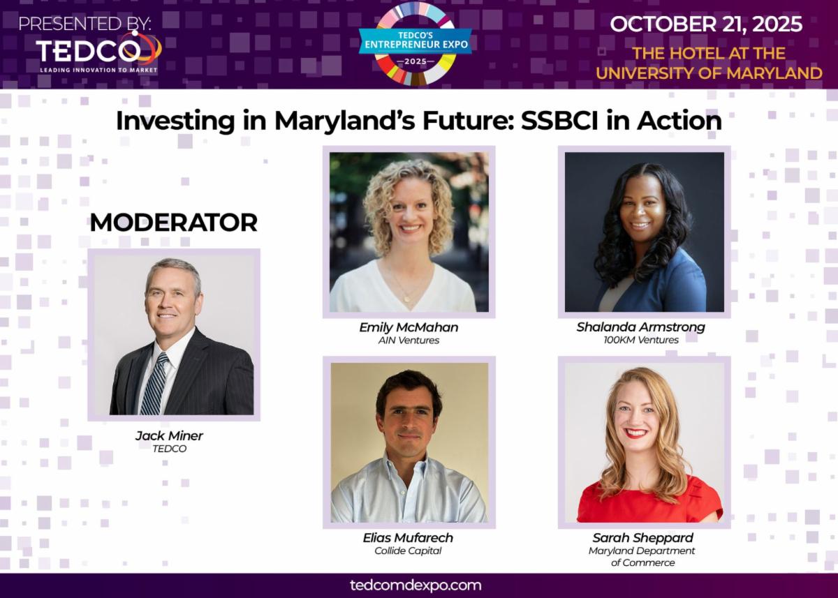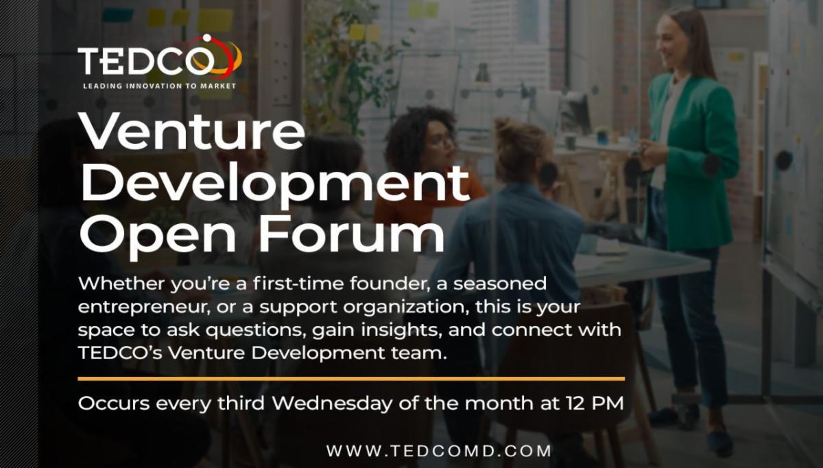 Events: TEDCO does not endorse or recommend any individual, business, or other entity presenting or hosting any webinar, podcast, or event. Any views shared on any of these formats are not necessarily shared by TEDCO. Unless otherwise stated, TEDCO has not contributed to the content or format of webinars, podcasts, or events promoted on this page.